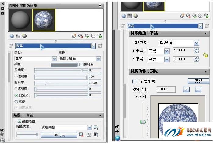 首先,要在材质面板中击“创建新材质”按钮,可命名为“青花”,接着,在“漫射贴图”中,浏览和选择你的青花图片文件。