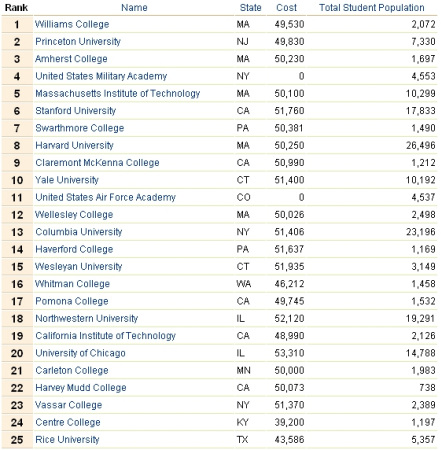 据路透社报道,在2010年美国大学最新排名中,马萨诸塞州一所小型私立学院荣登榜首,傲视哈佛和耶鲁等常春藤名校。 据悉,在福布斯网站编纂的排名中,在校生仅为2200人的威廉姆斯学院名列榜首,紧随其后的是普林斯顿大学和阿默斯特学院。 美国西点军校和麻省理工学院分列第4、第5,而哈佛和耶鲁大学则分别排名第8和第10。 福布斯和大学学费与绩效中心综合考虑学费、毕业生薪资等因素,对各大高校进行了排名。 其他考虑因素还包括,有多少教职员工和学生拿到罗兹奖学金或诺贝尔奖,并基于教育网站数据来衡量学生对在校学习经历的满意度。 福布斯副主编伊瓦尔特说:“那些不让学生背负沉重学费负担以及小班授课的学校,往往排名较高。”